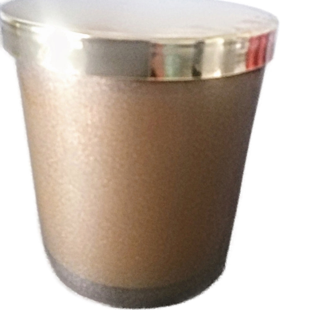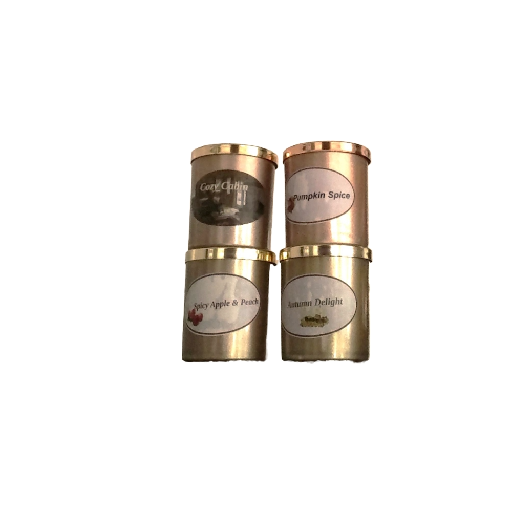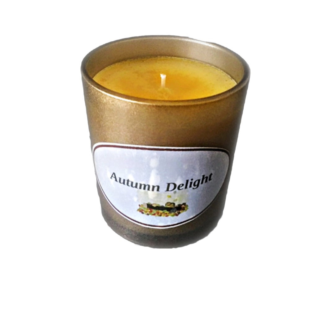 Warm spices and sweet Fall scents of molasses and candy apples are blended into a candle perfect for Autumn or Thanksgiving home decor. An all natural soy and coconut blend wax is colored the yellow of Fall leaves and hand poured into 10 oz tumblers painted a translucent metallic gold that sparkles. A shiny flat gold lid is included.