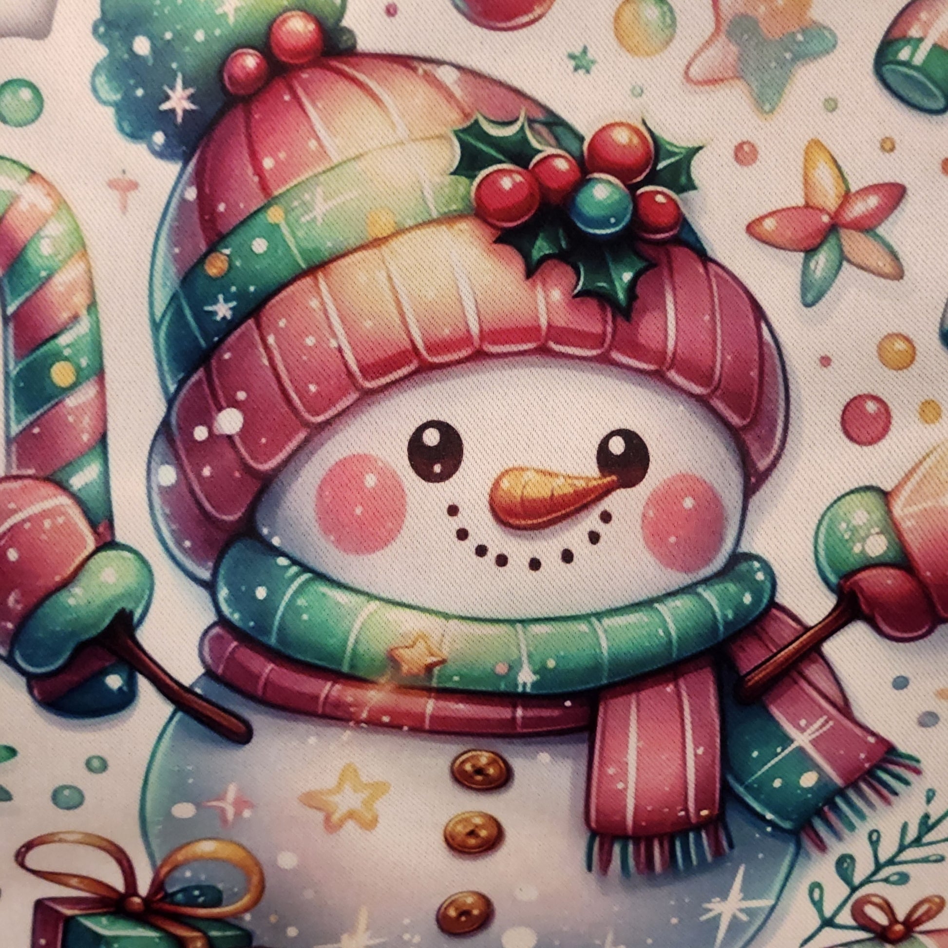 A yard flag features cheery, brightly accented snowman is surrounded by candy canes and Christmas sweets. The white flag is 100% polyester and imprinted on both sides. It measures 11.5 inches by 17 inches and fits any standard garden yard flag post. The image is pressed into the fabric making it resistant to fading. ( long term exposure to sunlight will produce some amount of fade). Post not included.