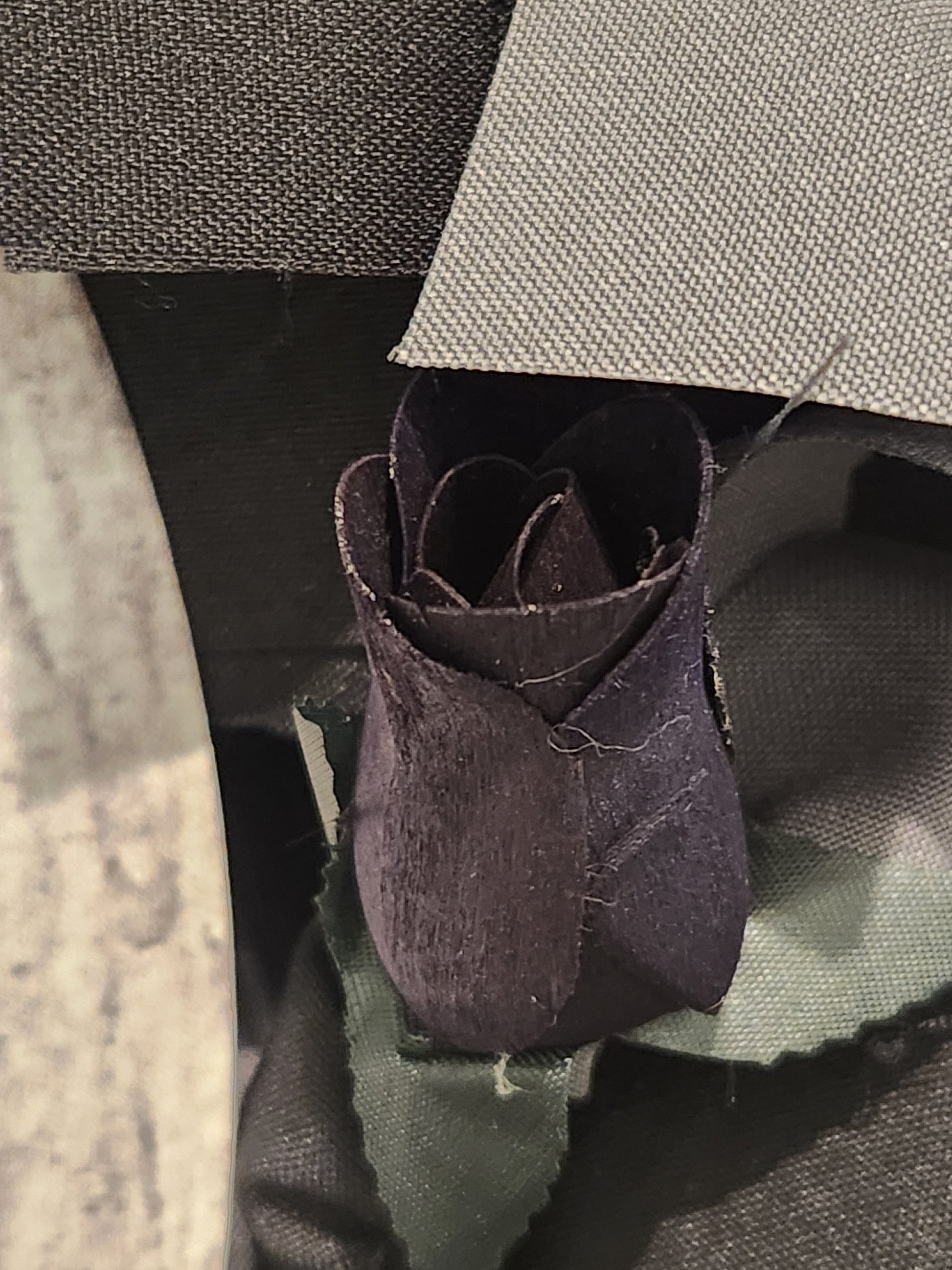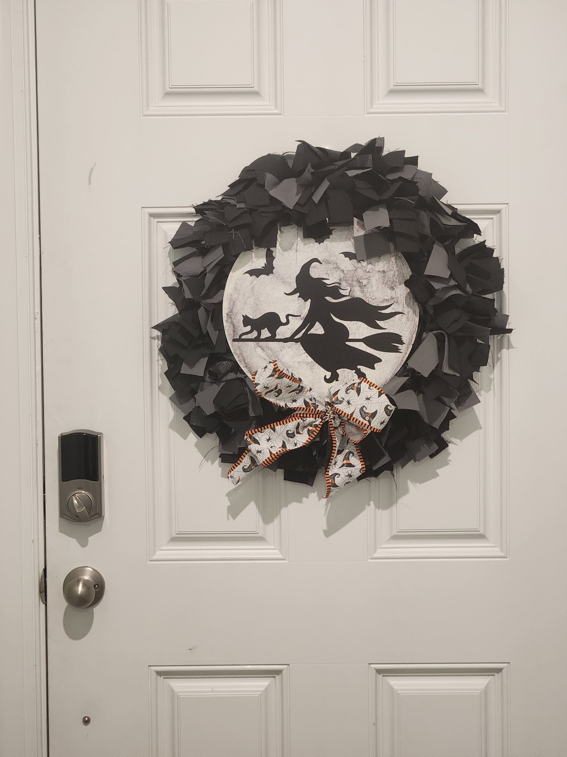 The Witch rag wreath is a delightfully spooky addition to your Halloween decor. This wreath is made from hand cut strips of black and grey fabric. It features a center plate depicting a witch and black cat on a broomstick. There are 3 black roses positioned within the wreath and it is finished with a black, grey and orange ribbon showing witch hats and spiders. The wreath measures 21 inches in diameter and approximately 4 inches thick. For indoor use only.