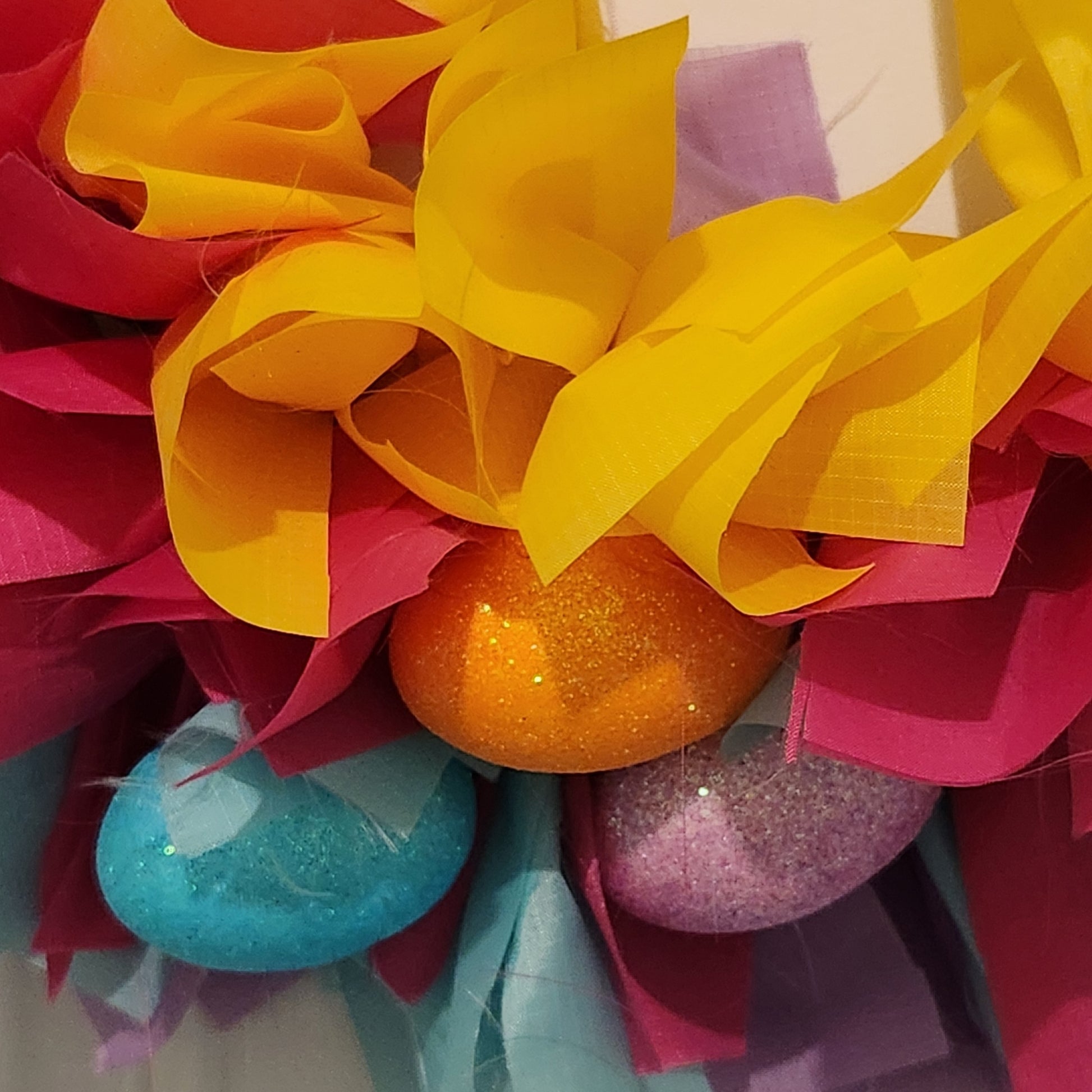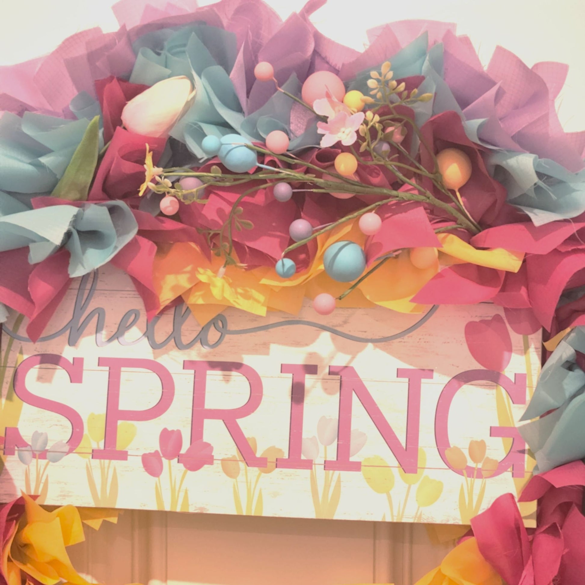 Say hello to Spring with this bright colorful rag wreath. The fabric is water resistant and tear resistant making it suitable for indoor or outdoor use in a protected area such as a porch. It is bright pink, yellow, lavender and light blue. The wreath is decorated with yellow and pale pink tulips, sparkly pastel colored eggs and a wooden sign that says "Helllo Spring". The wreath measures 22 inches in diameter and up to 5 inches thick - fully fluffed.