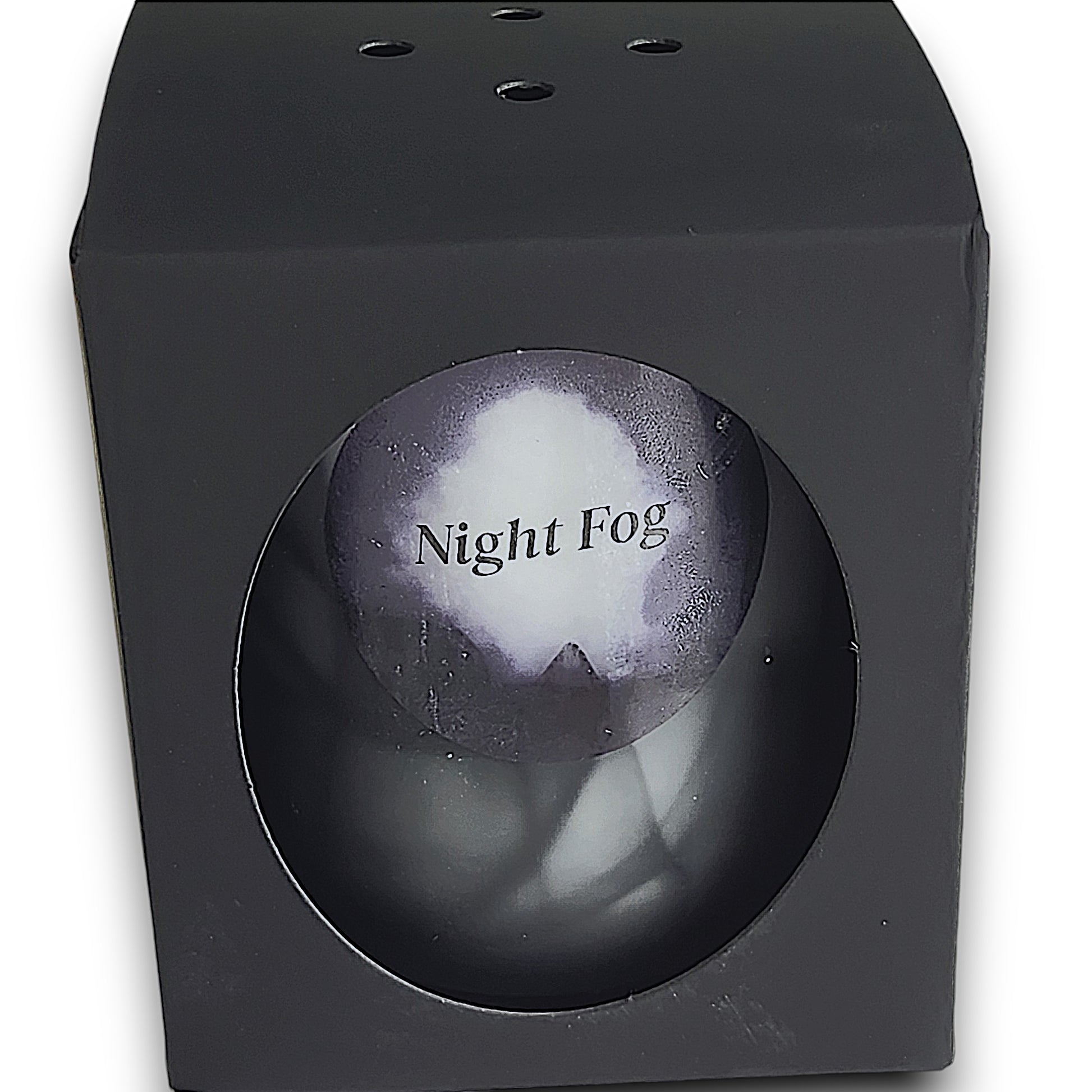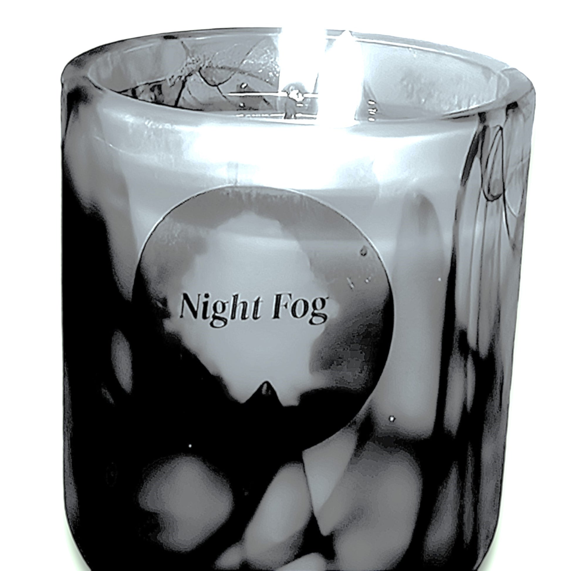 Celebrate Halloween or any Fall or winter night with the Night Fog candle. A heavy glass tumbler designed with black and white swirls mimics a foggy night. The 10 oz. pale grey candle is hand poured from a vegan blend of soy, coconut and sand waxes. The fragrance is a light blend of water, woods and a touch of vanilla. The double cotton wick ensures a complete melt pool. The candle comes in a black box with a window.