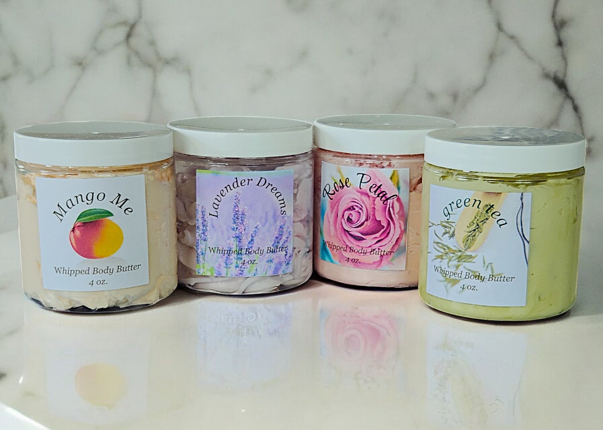 Moisturize your skin with luxurious whipped body butters. Each one is carefully hand crafted with natural ingredients. After shower, massage into skin. They do not leave greasy or sticky residue and smell great! Choose from 4 different blends.
